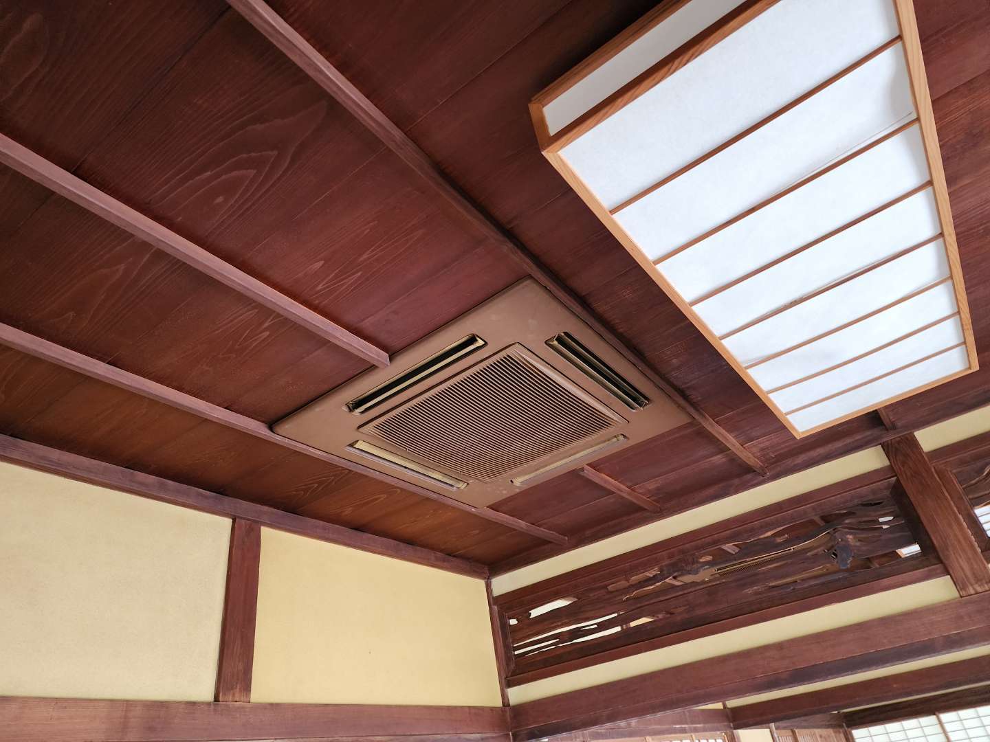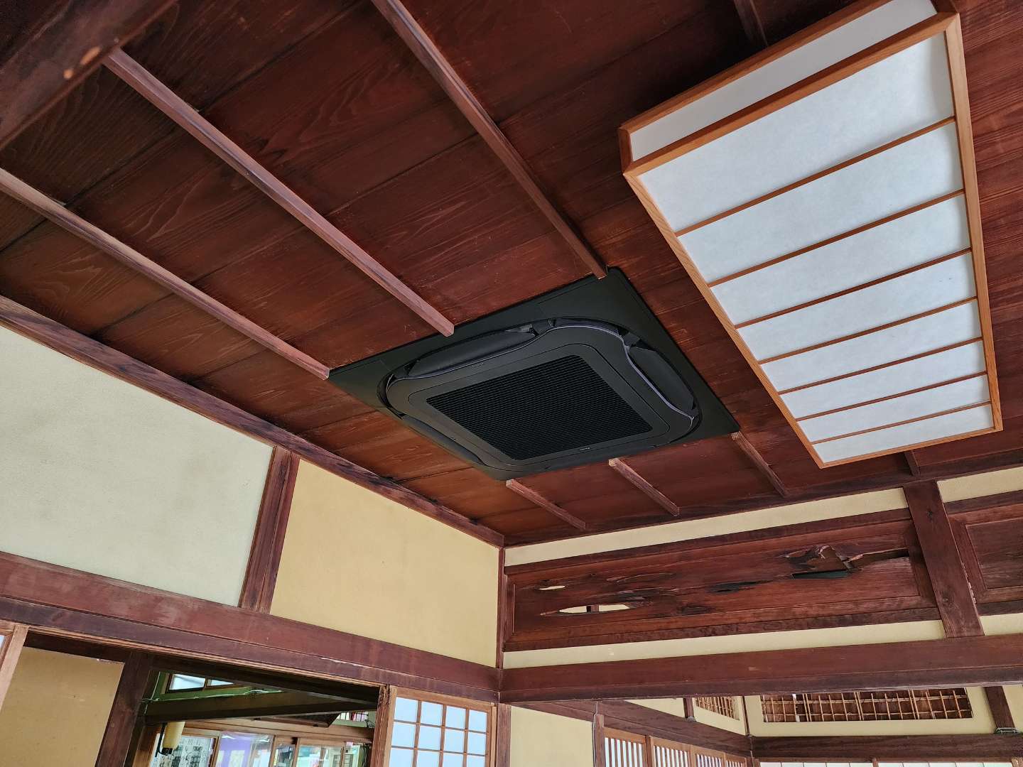 パネルはお施主さんに選んでいただきました。趣ある建物に合うよう、黒色のエアコンがかっこいいですね。